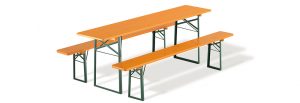 Die Standard-Bierzeltgarnitur besteht immer aus 1 Tisch (220×50) sowie 2 Sitzbänken (ohne Lehnen).